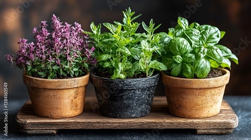 herb, thyme, mint, basil, plant, pot, pot, gardening, kitchen, cooking, food, healthy, fresh, green, purple, leaf, aromatic, fragrant, organic, natural, growth, spring, summer, agriculture, botany, flora, horticulture, vegetable, spice, favor, ingredient, aroma, scent, nature, rustic, wooden, terracotta, container, dirtied, cultivation, planting, harvest, wellness, lifestyle, domestic, home, garden, tray