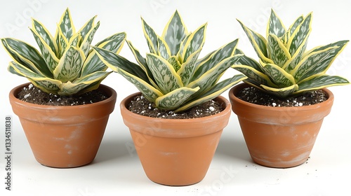 Three potted Sansevieria trifasciata 'Laurentii' plants.