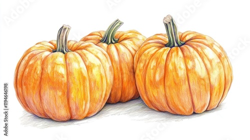 Three pumpkins illustration, still life, vibrant orange color, art piece, for educational purposes