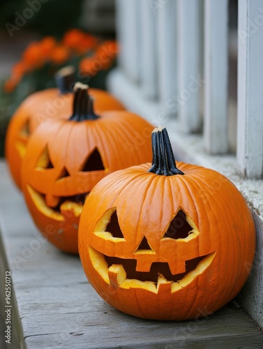 Three pumpkins with faces carved into them sit on a wooden railing