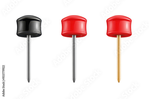 Three push pins, one black and two red, isolated on transparent background. for office and stationery uses.