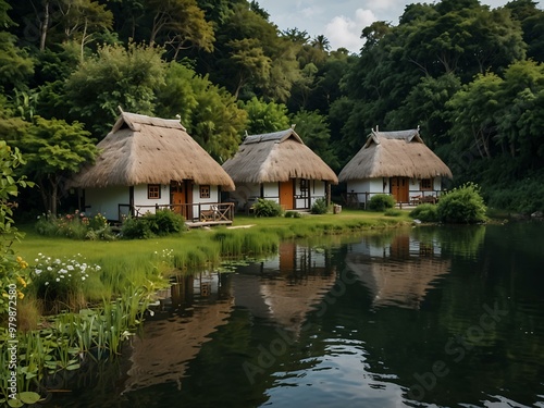 Three quaint cottages with thatched roofs on a small island, surrounded by greenery and water.
