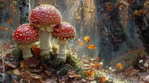Three red Amanita muscaria mushrooms stand out on moss in a forest, surrounded by fallen leaves. The vibrant image suggests a sunny autumn day.