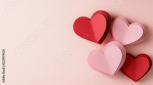 Three red and pink heart cutouts arranged on a soft pink background for romantic decor or greeting cards