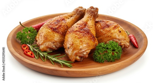 Three roasted chicken drumsticks on a wooden plate with herbs and chili peppers presented nicely