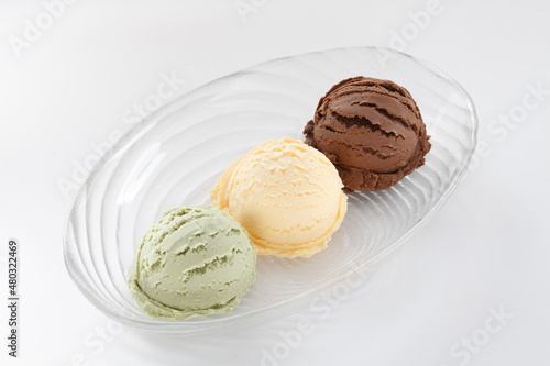 Three scoops of ice cream, chocolate,vanilla,green tea ice cream in a long plate on white background.