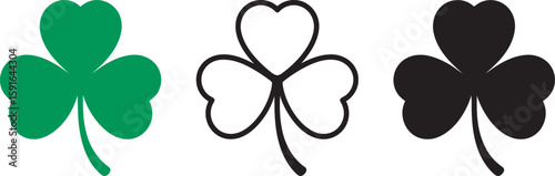 Three shamrock illustrations in green, black outline, and solid black offer a St Patricks Day graphic resource.