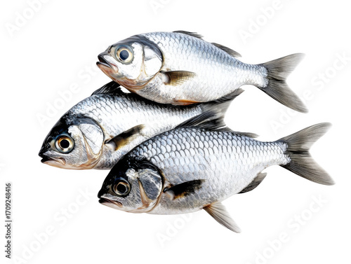 Three silver fish stacked together on a black background showing their scales and fins in detail