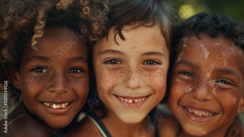 three, smiling, children, varied, hair, texture, face, close, together, friendly, heartwarming, atmosphere