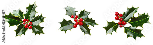 Three Sprigs Of Holly With Red Berries Isolated On A Transparent Background