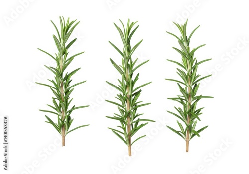 Three sprigs of rosemary arranged vertically in a simple pattern isolated on white background