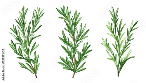 three sprigs of rosemary showcasing their vibrant green leaves in a detailed and artistic manner illustration highlights the herb's natural beauty and culinary significance