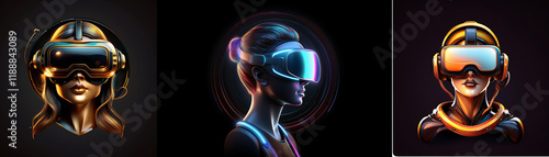 Three stylized portraits of women immersed in virtual reality, showcasing futuristic headgear and glowing effects. The artwork explores themes of technology and the metaverse.