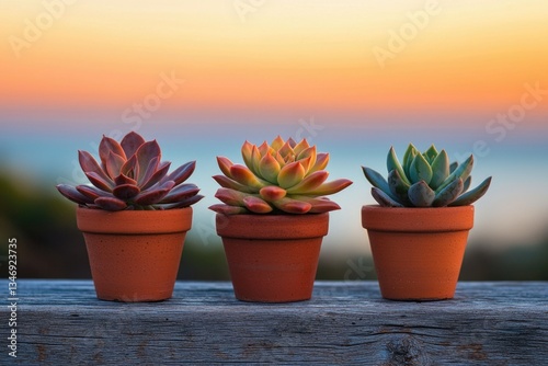 Three succulent plants in terracotta pots, beautifully arranged against a sunset backdrop.