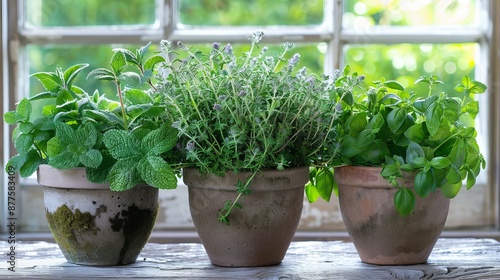 Three tasty herbs—lemon balm, rosemary, and mint—arranged in a country-style setting.