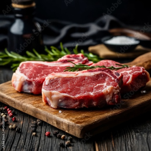 pork meat, epicure, thick, slice, wooden, board, rosemary, salt, peppercorn, culinary, cooking, ingredient, tasty, kitchen, dish, presentation, meat, fresh, prepared, flavorful, steak, serve, food, cookery, visual, preparation, chef, delightful, tempting, artful, savoury, rustic, premium, quality, raw, aesthetic, contemporary, mastery