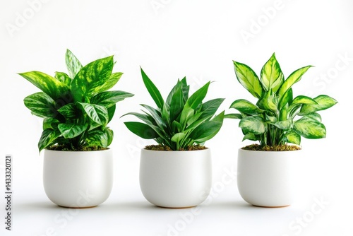 Three vibrant green houseplants in sleek white pots, adding a touch of nature indoors.