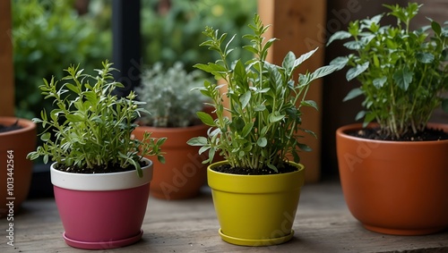 Three vibrant herb plants in modern pots for kitchen gardens.