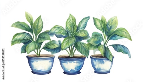 Three vibrant potted plants with lush green leaves in decorative blue pots