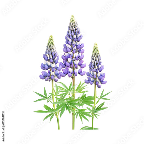 Three vibrant purple and white lupines stand tall showcasing their beauty against a black background a delightful floral trio
