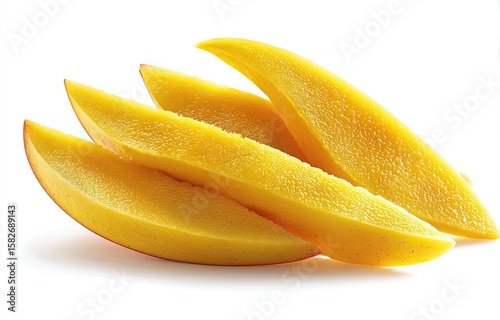 Three vibrant yellow mango slices, glistening, arranged slightly overlapping against a stark white background, showcasing their juicy texture and ripe color