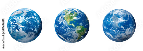Three views of planet Earth against a white background show continents transparent background Generative AI
