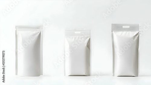Three White Blank Pouch Packaging Mockups With Ziplock Closures In Different Sizes On White Background 3D Rendering