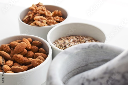 Three white containers with almonds, walnuts and a mixture of sunflower, sesame and chia seeds near a marble mortar.