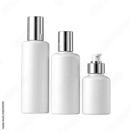 Three white cosmetic bottles, various sizes, with silver caps