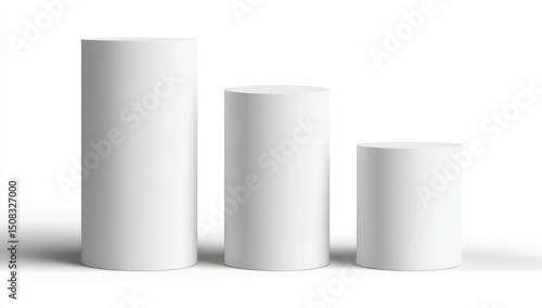 cylinder, white, dais, display, three, height, stage, object, blank, empty, geometric, modern, minimalist, simple, shape, round, vertical, stack, ascending, contrast, light, shadow, product, presentation, promotion, exhibition, architecture, design, rendering, three-dimensional, illustration, graphic, staging, form, neutral, clean, studio