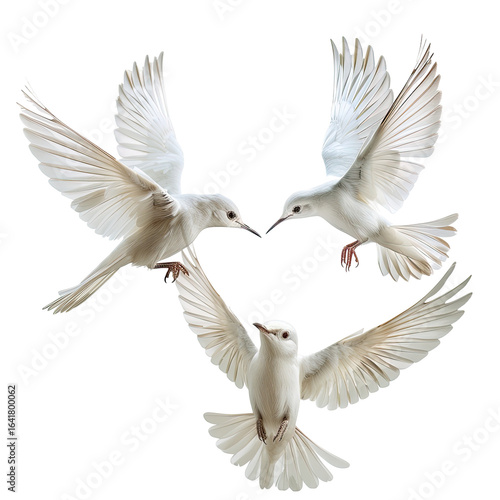 Three white doves in flight forming heart, nature background, peace symbol, card design