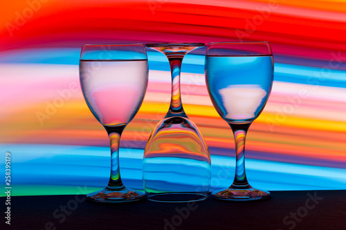 glasses, goggles, wine, wine glass, drink, alcohol, isolated, empty, copy space, transparent, glassware, crystal, beverage, clean, liquid, bar, celebration, party, silhouette, light, painting, three, row, vibrant, colours, colourful, many-coloured, distorted, black, white, red, blue, orange, yellow, green, pink, bright, purple