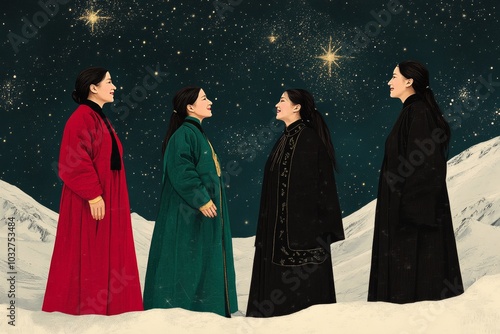 Three women dressed in traditional long coats standing in a snowy landscape under a starlit sky symbolizing cultural unity winter traditions and the peaceful beauty of nighttime