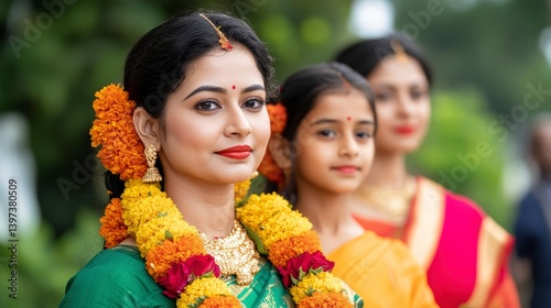 woman, tradition, floral, nature, celebration, culture, harmony, portrait, beauty, happiness, colours, lifestyle, diversity, joy, family, togetherness, attire, ethnicity, summer, park, bright, candid, elegance, day, vibrant, greenery, peace, casual attire, freshness, spirit, bonding, friendship, oneness, festival, expression, joyfulness, serene, casual clothes, grace, gathering, smile, loving, together, female