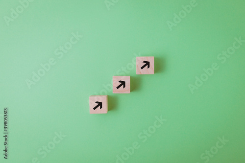 Three wooden cubes with black arrows symbolizing growth. Green background, copy space