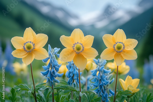 flower, yellow, bloom, blue, mountain, background, nature, spring, summer, flower petals, three, trio, vibrant, colourful, scenery, landscape, beauty, delicate, pretty, stunning, gorgeous, amazing, flora, botanical, plant, greenery, meadow, field, alpine, wildflower, blossom, pastel, shades, hue, light, bright, green