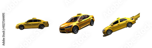Three yellow taxi cabs shown with different angles and cropped against a white background.