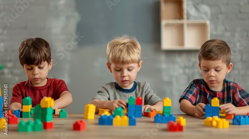 Three young boys playing with colorful building blocks at a table.