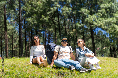Three Young Friends Hiking in Nature Forest Happy looking for directions Trekking in National Park