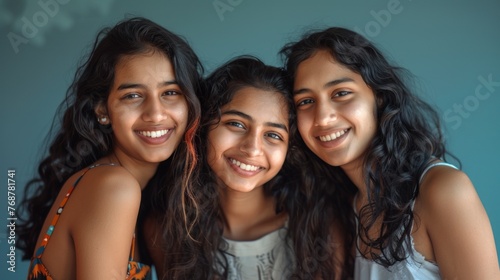 Three young women with long dark hair smiling and posing closely together against a light blue background.