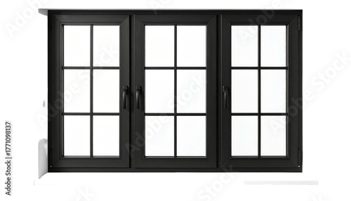 Three-pane window with black frames and grid design, isolated on a black background. Minimalist architecture style