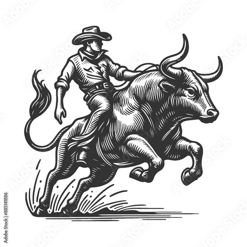 thrilling action of a rodeo cowboy expertly riding a bucking bull sketch engraving generative ai fictional character raster illustration. Scratch board imitation. Black and white image.