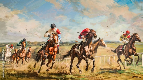 Thrilling horse race with jockeys encouraging their mounts to ride faster. Games, hand drawn style, competition, match, confrontation, sports betting, training race, high speed. Generative by AI.