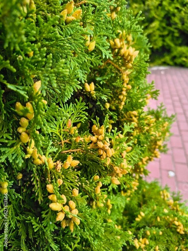 thuja blossoms. Beautiful young green thuja branch in the park. A cypress tree in the wind. Evergreen trees with a pyramidal crown - a tree from the Garden of Eden. small cones on a branch.