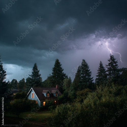 Thunder and thunderbolt before rain at night with black shadow of houses and trees on background