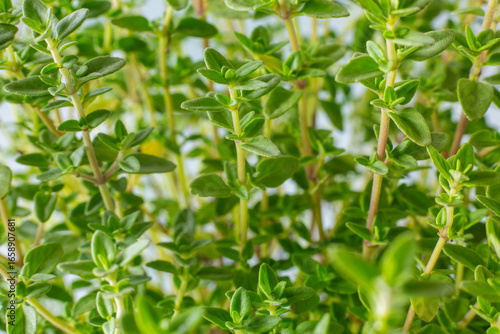 Thyme plant growing in organic herb garden. Green thyme background.Aromatic herbs. Close up