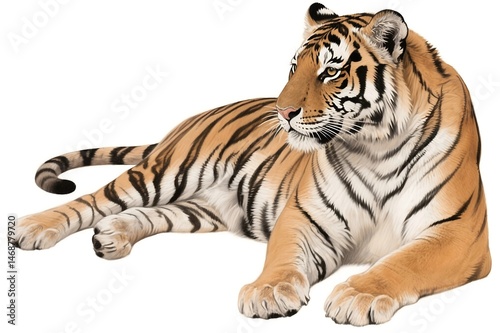 Tiger drawing depicting a bengal tiger resting on a clean white background. Suitable for wildlife illustrations, kids books, and educational materials.