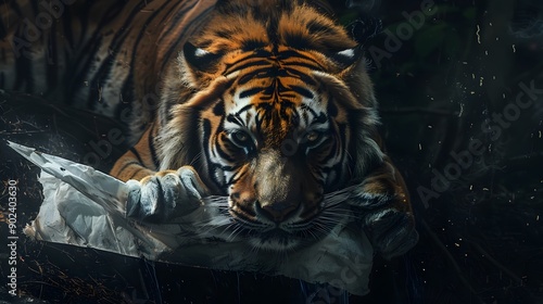 Tiger Holding White Flag: A fierce tiger lying down, gently holding a white flag with its mouth.