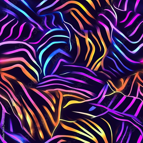 tiger, stripes, neon, glowing, seamless, pattern, design, texture, background, repeat, animal, print, bright, vibrant, colourful, fashion, clothing, textile, wallpaper, graphic, illustration, digital, art, abstract, modern, trendy, style, geometric, bold, energy, wild, nature, wildlife, night, light, effect, surface, material, decorative, stylish, creative, aesthetic, visual