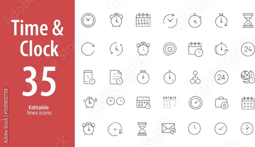 Time and Clock Line Icons, Wall Clock, Timer, Stopwatch, and More, Editable Formats: AI, EPS, JPG, PNG, Ideal for Both Digital and Print Use